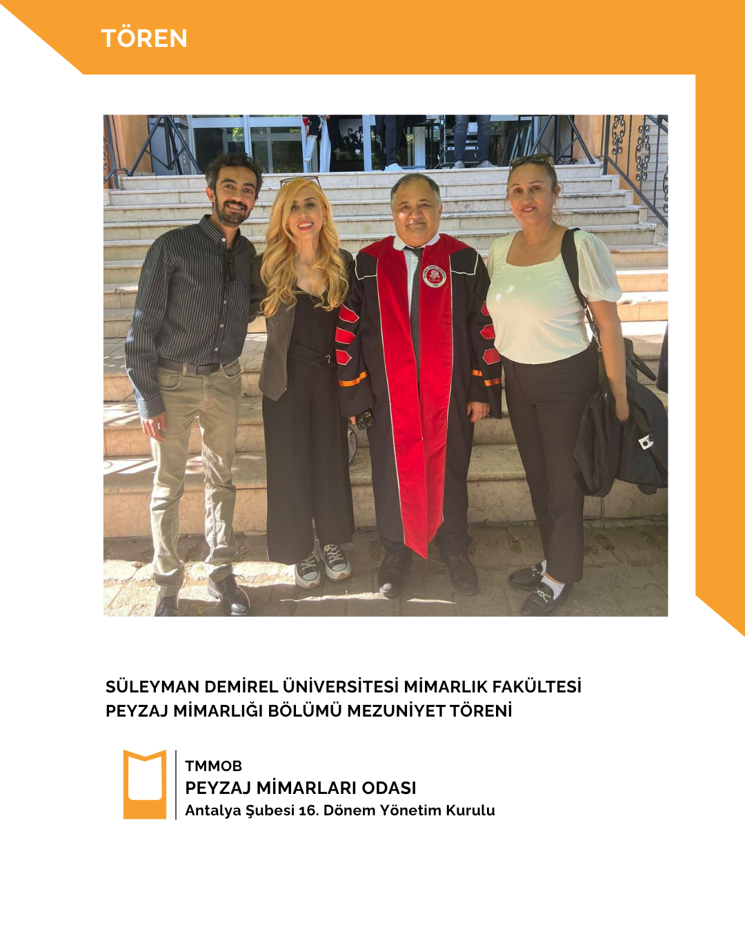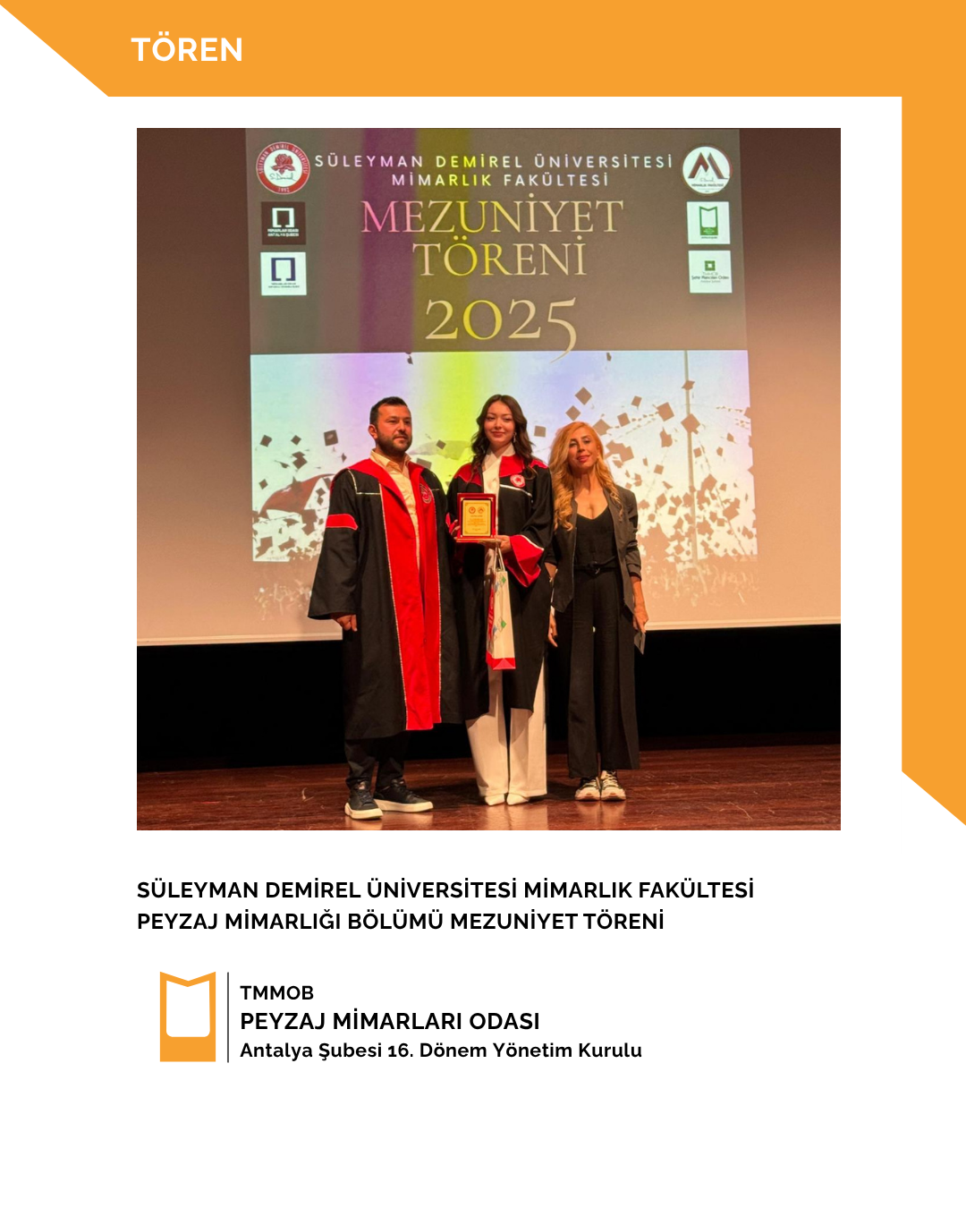 30 Haziran 2025 tarihinde Süleyman Demirel Üniversitesi Mimarlık Fakültesi Peyzaj Mimarlığı Mezuniyet Töreni'ne Şube Başkanı Gülsüm KILDAN ve Şube Yönetim Kurulu Üyesi Ayla ERYILMAZ katılım sağlamıştır.