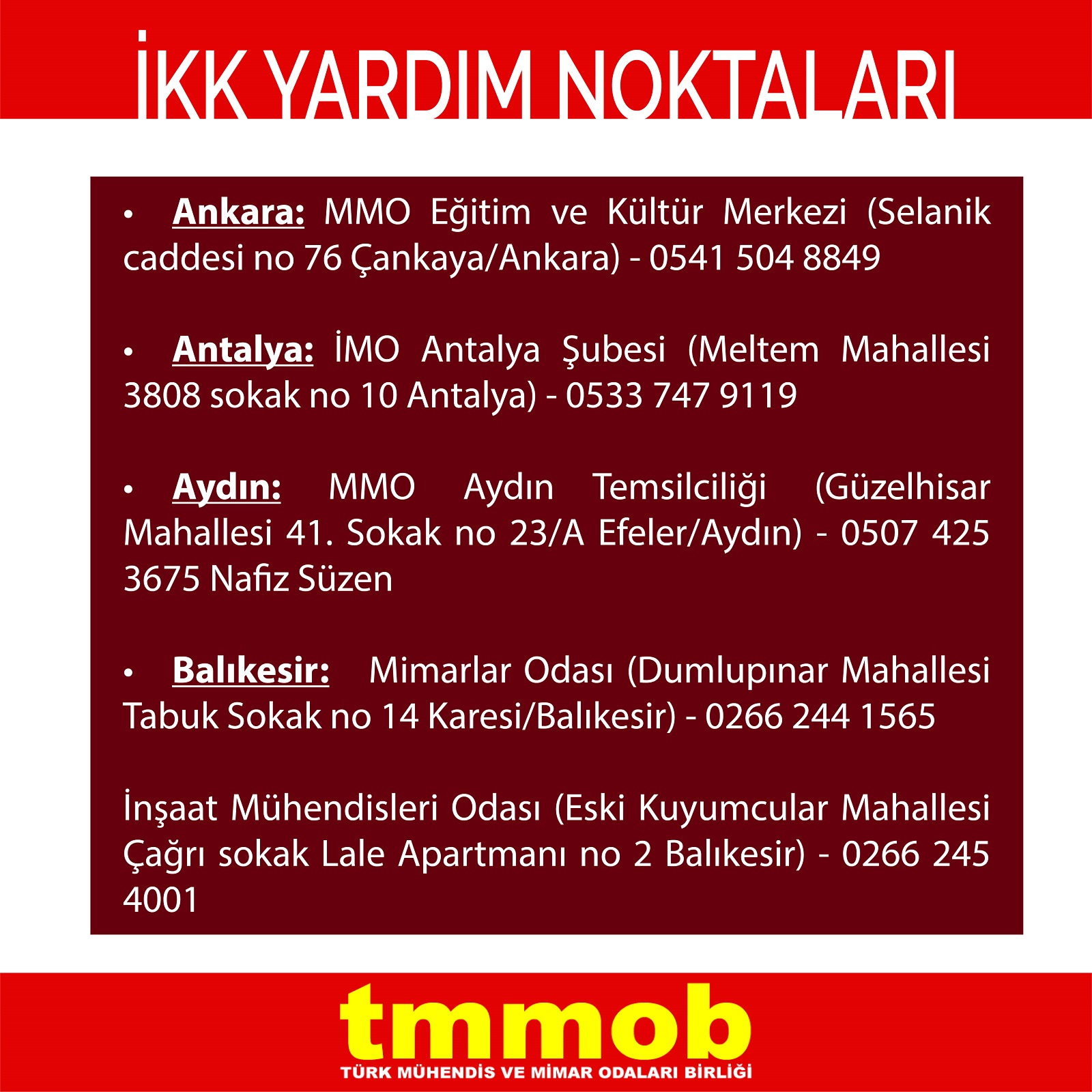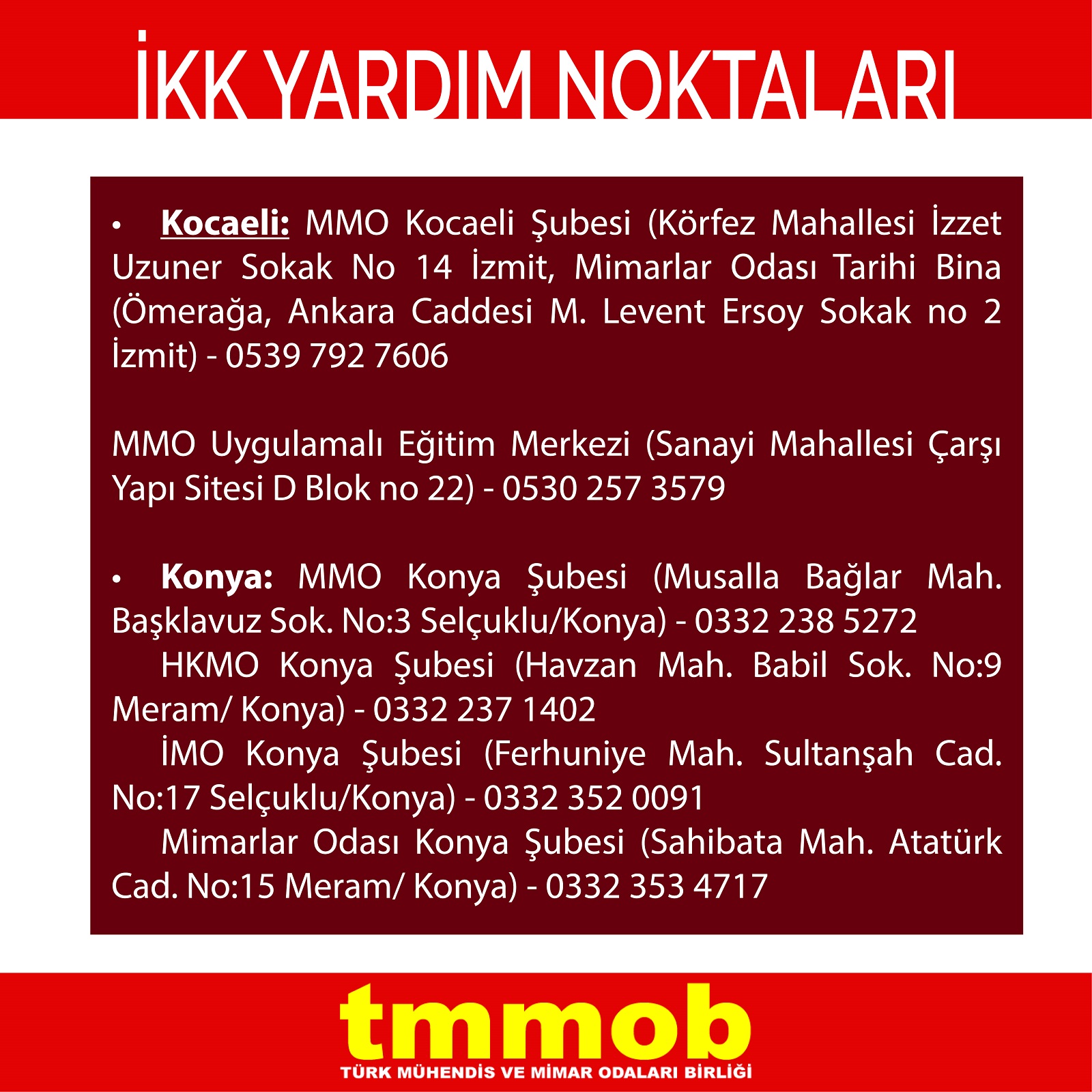 | Konya | İMO Konya Şubesi (Ferhuniye Mah. Sultanşah Cad. No:17 Selçuklu/Konya | 0332 352 0091 |