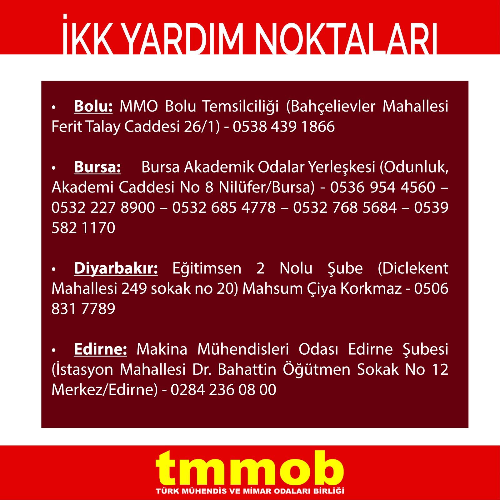 | Edirne | Makina Mühendisleri Odası Edirne Şubesi (İstasyon Mahallesi Dr. Bahattin Öğütmen Sokak No 12 Merkez/Edirne) | 0284 236 08 00 |