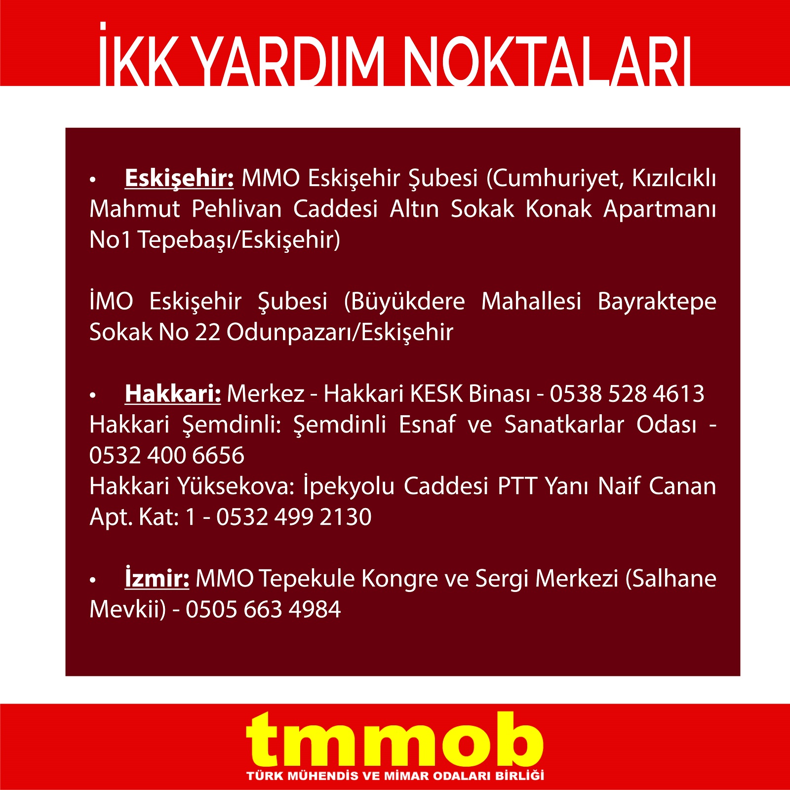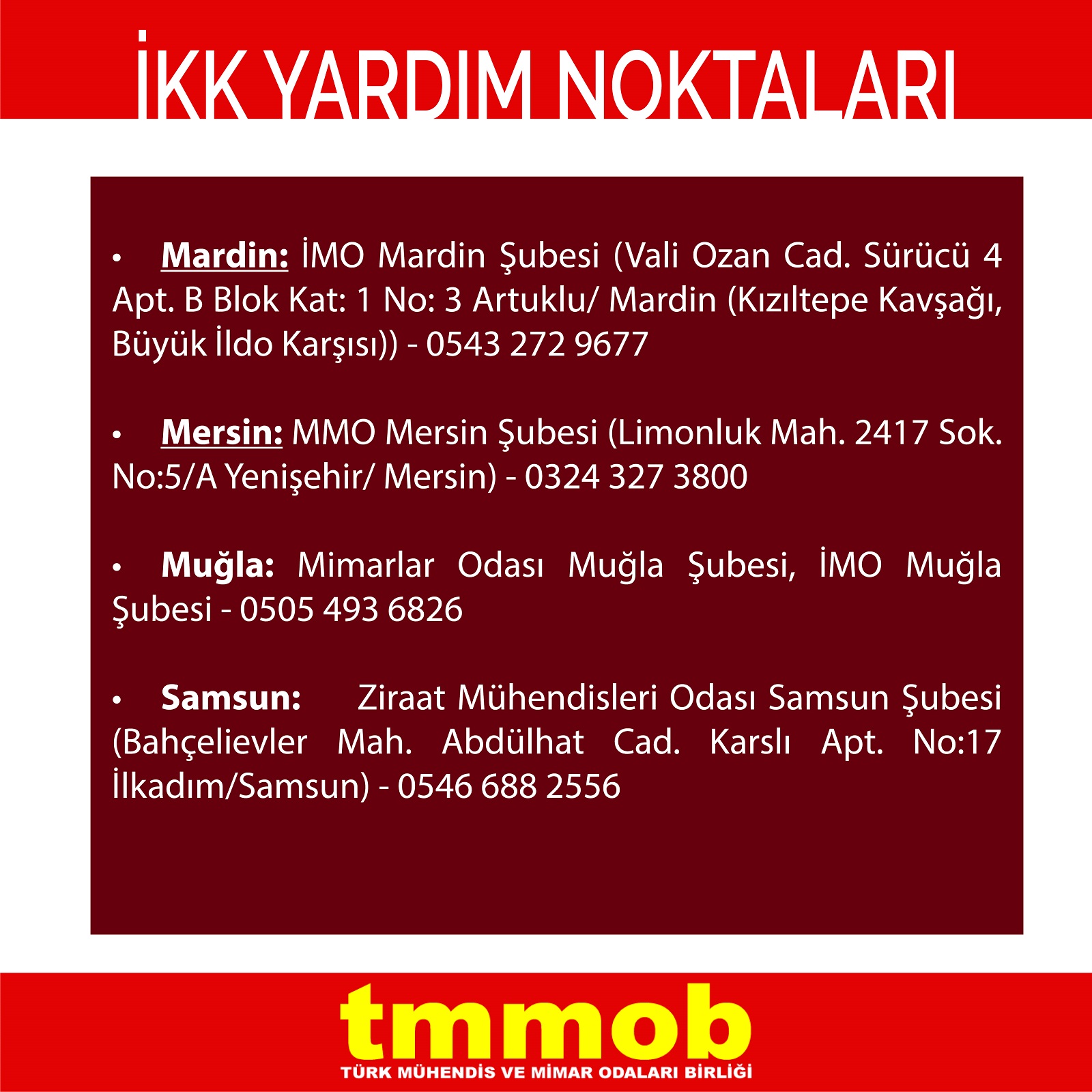 | Mardin | İMO Mardin Şubesi (Vali Ozan Cad. Sürücü 4 Apt. B Blok Kat: 1 No: 3 Artuklu/ Mardin (Kızıltepe Kavşağı, Büyük İldo Karşısı)) | 0543 272 9677 |