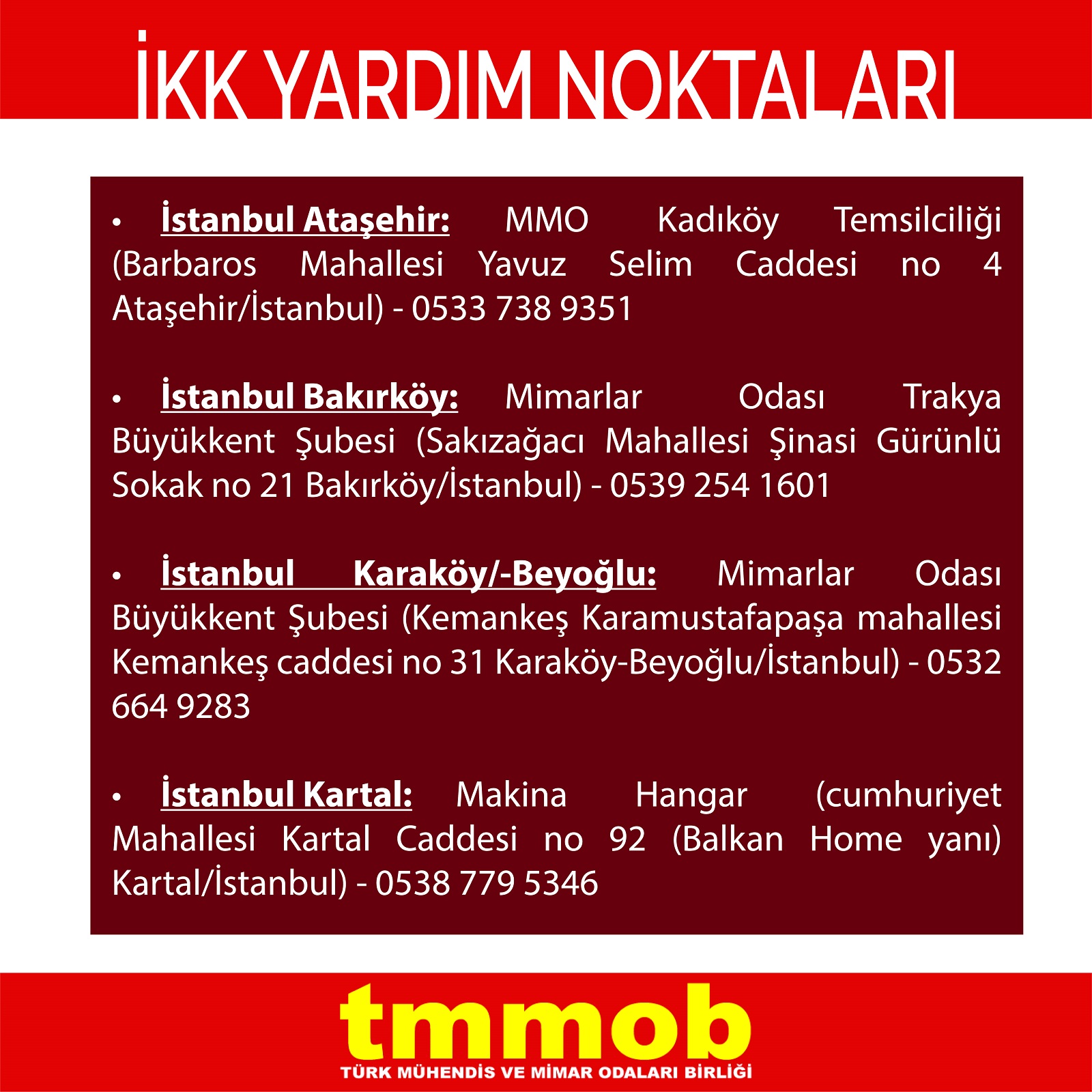 | Kocaeli | MMO Kocaeli Şubesi (Körfez Mahallesi İzzet Uzuner Sokak No 14 İzmit, Mimarlar Odası Tarihi Bina (Ömerağa, Ankara Caddesi M. Levent Ersoy Sokak no 2 İzmit) | 0539 792 7606 |