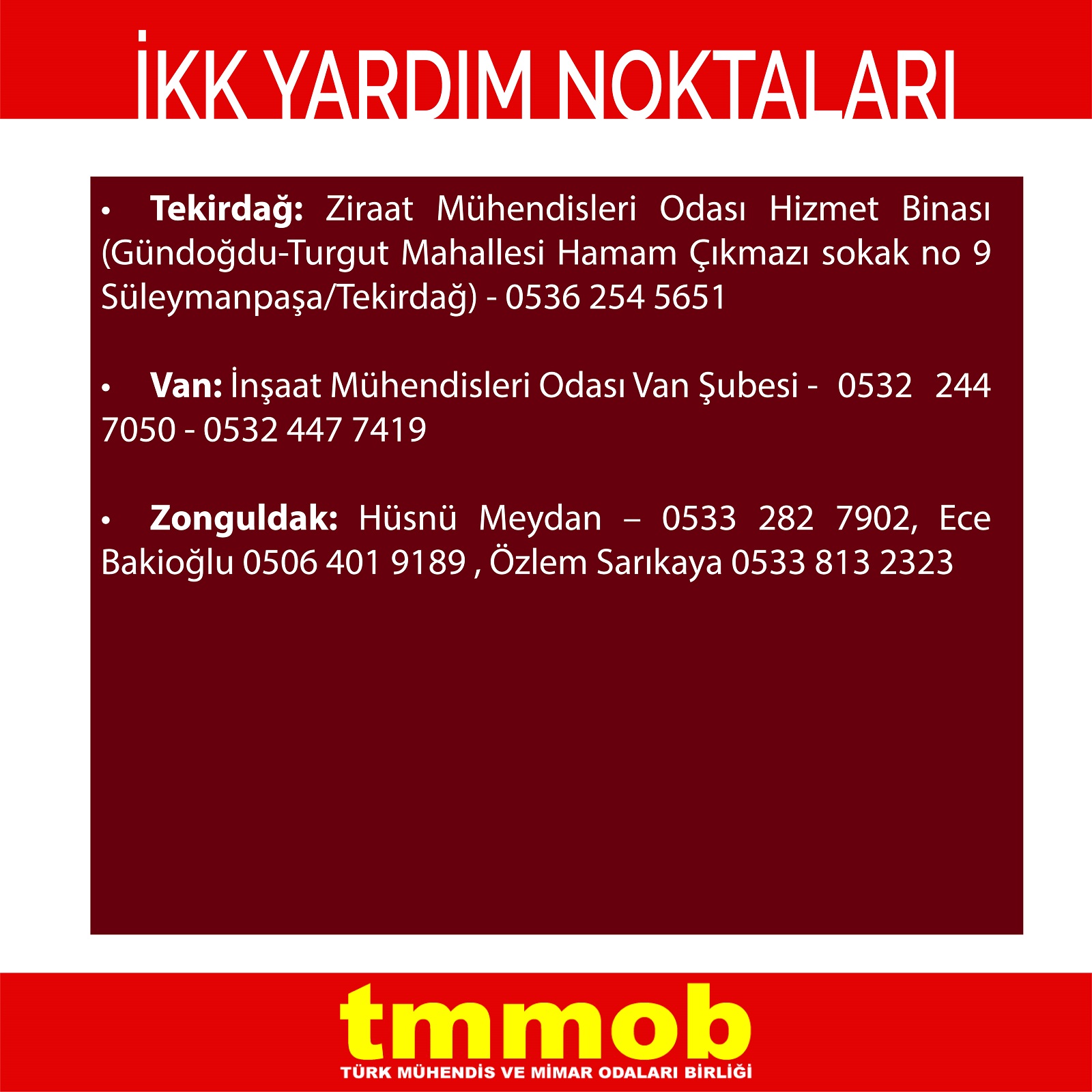| Tekirdağ | Ziraat Mühendisleri Odası Hizmet Binası (Gündoğdu-Turgut Mahallesi Hamam Çıkmazı sokak no 9 Süleymanpaşa/Tekirdağ) | 0536 254 5651 |