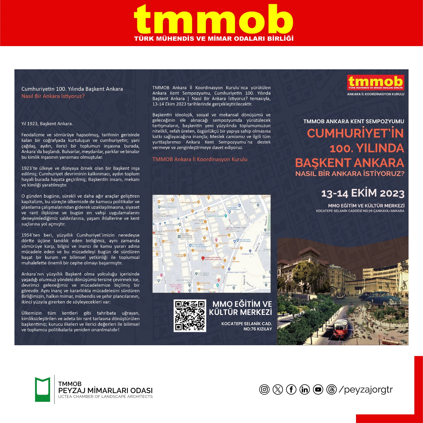 TMMOB Ankara İl Koordinasyon Kurulu tarafından 13-14 Ekim 2023 tarihlerinde TMMOB Ankara Kent Sempozyumu "Cumhuriyetin 100. Yılında Başkent Ankara, Nasıl Bir Ankara İstiyoruz?" başlığı ile MMO Eğitim ve Kültür Merkezinde gerçekleştirilecektir.