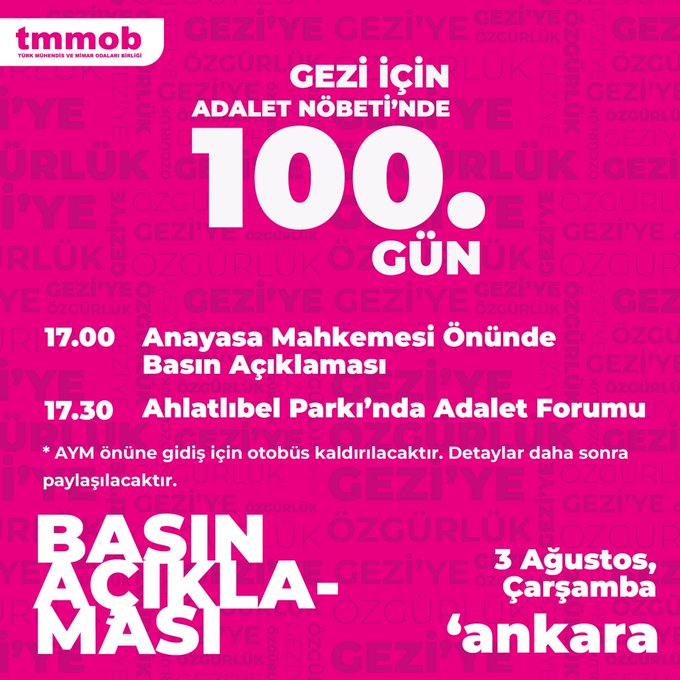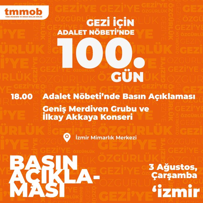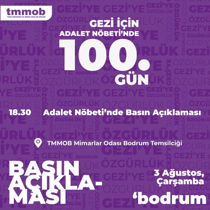 Gezi Davasında verilen hukuksuz kararlar ile tutuklanan TMMOB Yönetim Kurulu üyesi Mücella Yapıcı, Şehir Plancıları Odası Onur Kurulu üyesi Tayfun Kahraman ve Mimarlar Odası avukatı Can Atalay ile diğer tutuklu yurttaşlarımız için yürütülen Adalet Nöbetinin 100. Gününde sesimizi yükseltiyoruz.