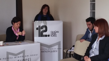 27 Şubat, 2016 tarihinde TMMOB Peyzaj Mimarları Odası Antalya Şubesinde yapılan Peyzaj Mimarları Odası 12. Dönem Antalya Şubesi Genel Kurulu; Divan Seçimi, Saygı Duruşu ve 11. Dönem Yönetim Kurulu Başkanı Keziban Arıcan‘ın açılış konuşması ile başladı, Genel Kurul` un Divan Başkanlığını Zeynep Güneş yaptı.