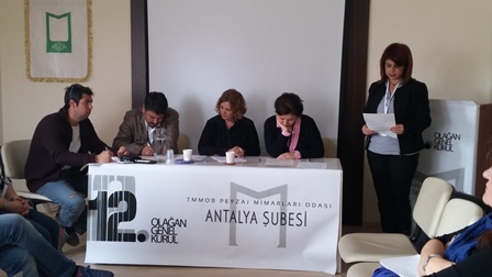 27 Şubat, 2016 tarihinde TMMOB Peyzaj Mimarları Odası Antalya Şubesinde yapılan Peyzaj Mimarları Odası 12. Dönem Antalya Şubesi Genel Kurulu; Divan Seçimi, Saygı Duruşu ve 11. Dönem Yönetim Kurulu Başkanı Keziban Arıcan‘ın açılış konuşması ile başladı, Genel Kurul` un Divan Başkanlığını Zeynep Güneş yaptı.
