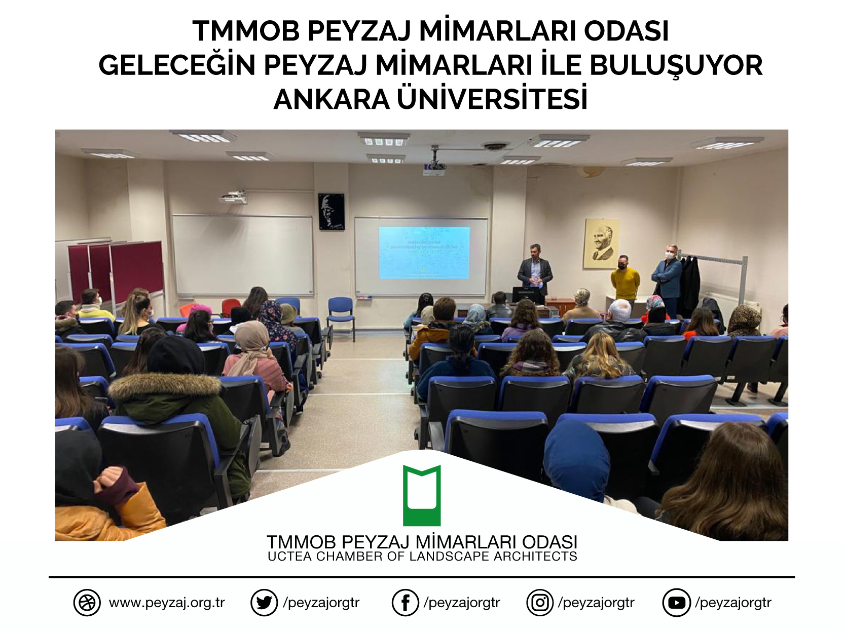 TMMOB Peyzaj Mimarları Odası olarak 22 Aralık 2021 Çarşamba günü Ankara Üniversitesi Ziraat Fakültesi Peyzaj Mimarlığı Bölümü öğrencileriyle "Peyzaj Mimarları Odası Geleceğin Peyzaj Mimarları İle Buluşuyor" söyleşisinde bir araya gelinmiştir.
