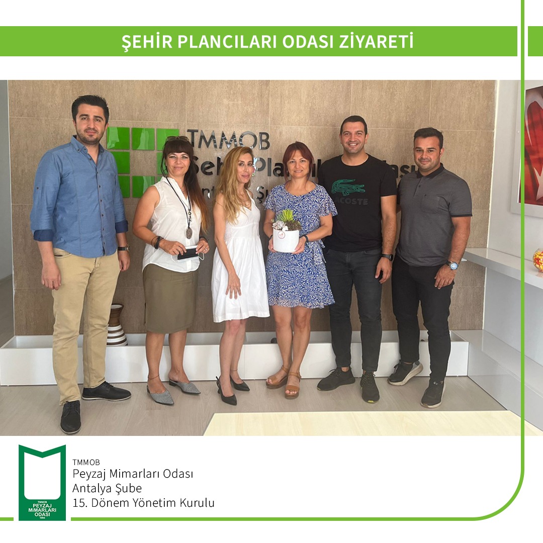 25 Temmuz 2022 tarihinde TMMOB Peyzaj Mimarları Odası Antalya Şubesi 15. Dönem Yönetim Kurulu Şube Başkanı Gülsüm KILDAN, Şube Yazmanı Rıfat OLGUN ve Yönetim Kurulu Üyesi Omca COŞARCAN KAYA TMMOB Şehir Plancıları Odası Antalya Şubesi`ne ziyaret gerçekleştirmişlerdir.