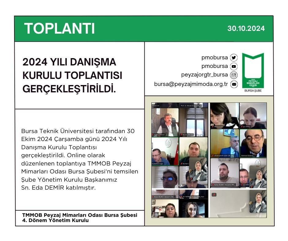 Online olarak düzenlenen toplantıya TMMOB Peyzaj Mimarları Odası Bursa Şubesi ‘ni temsilen Şube Yönetim Kurulu Başkanımız Sn. Eda DEMİR katılmıştır.