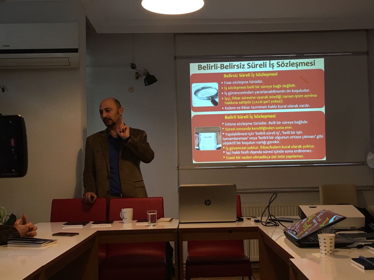 Etkinlik Oda‘mız Devamlı Eğitim Sistemi Merkezi Sorumlusu Bayazıt Oğuz AYOĞLU‘nun açılış konuşması ile başladı. DİSK Sosyal-İş Sendikası Uzmanlarından Çalışma Ekonomisi ve Endüstri İlişkileri Uzmanı Onur BAKIR‘ın ücretli çalışan meslektaşların sorunlarına ilişkin sunumunu gerçekleştirdi. TMMOB-SGK Protokolü, iş sözleşmesi türleri, iş akdinin sonlandırılması, yıllık izinler, fazla mesai, tazminatlar, sendikal örgütlenme olanaklarının yanı sıra, Meslek Odamız‘ın ücretli çalışanlara yönelik hizmetleri vb. pek çok konuda yapılan bilgilendirmeler örnekler üzerinden katılımcılara aktarılırken, karşılıklı soru cevaplar ile etkinliğe devam edildi.