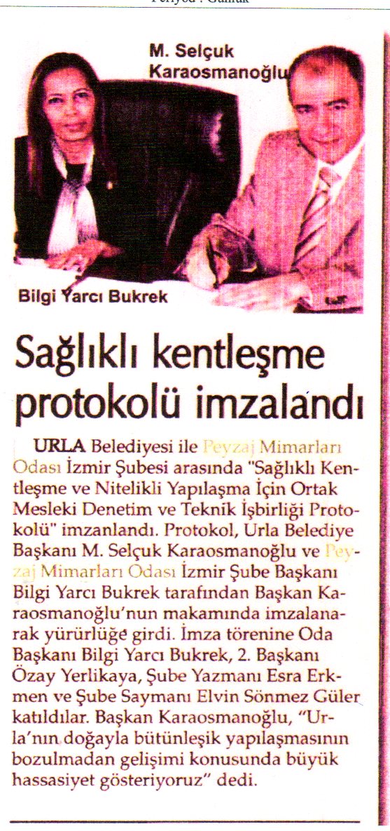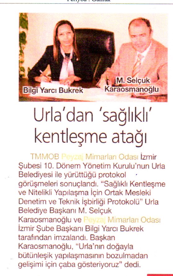 TMMOB Peyzaj Mimarları Odası İzmir Şubesi 10ncu Dönem Yönetim Kurulu olarak Urla Belediyesi ile yürütülen protokol görüşmeleri sonuçlanmıştır. Odamız İzmir Şubesi ile Urla Belediyesi arasında " Sağlıklı Kentleşme ve Nitelikli Yapılaşma İçin Ortak Mesleki Denetim ve Teknik İşbirliği Protokolü" Urla Belediye Başkanı Sn. M. Selçuk Karaosmanoğlu ve Şube Başkanımız Sn. Bilgi Yarcı Bukrek tarafından 20 Mart 2013 (Çarşamba) tarihinde imzalanarak yürürlüğe girmiştir.
