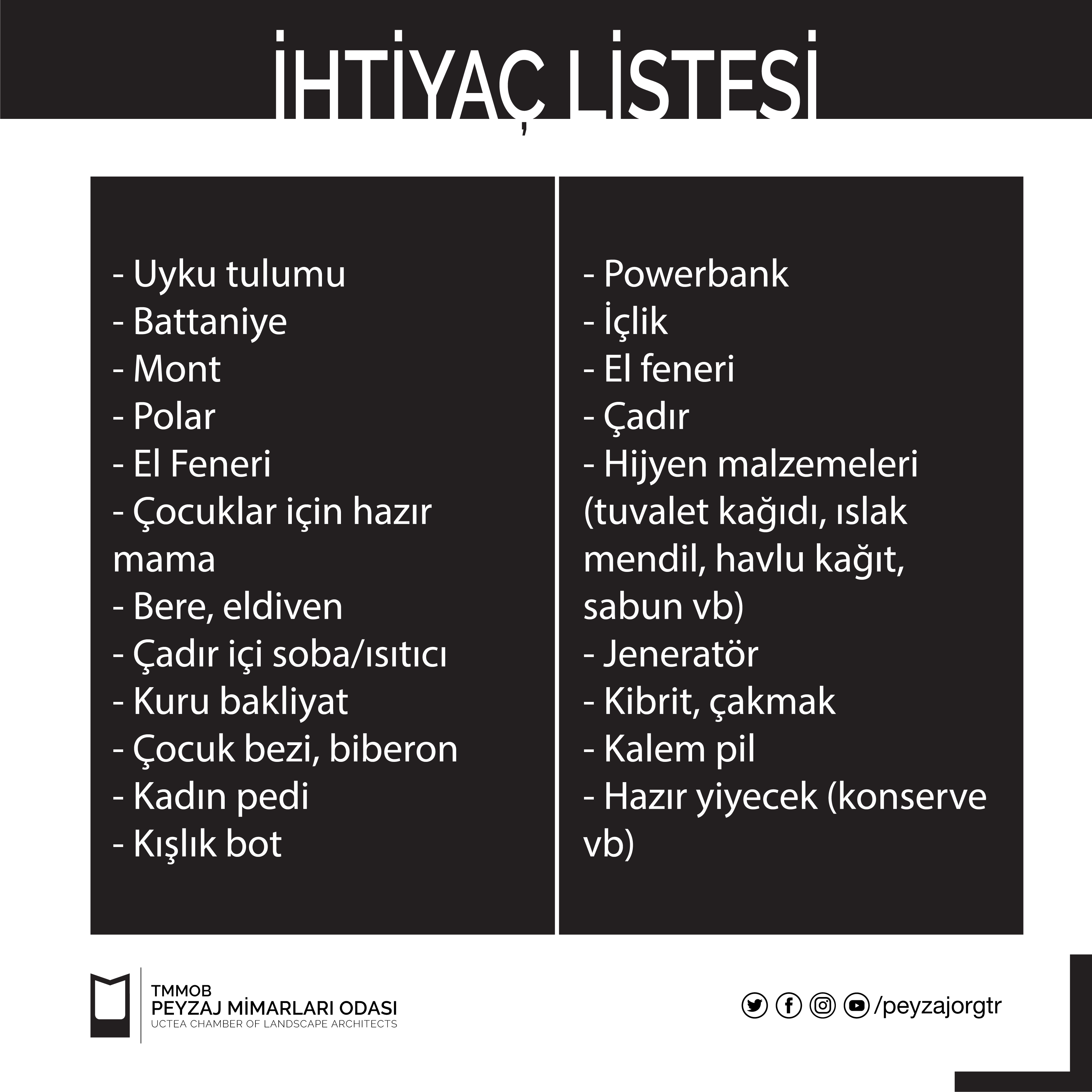 Yardım etmek isteyen üyelerimiz için ihtiyaç listesi ve teslim edebilecekleri noktaların bilgileri paylaşılmıştır.
