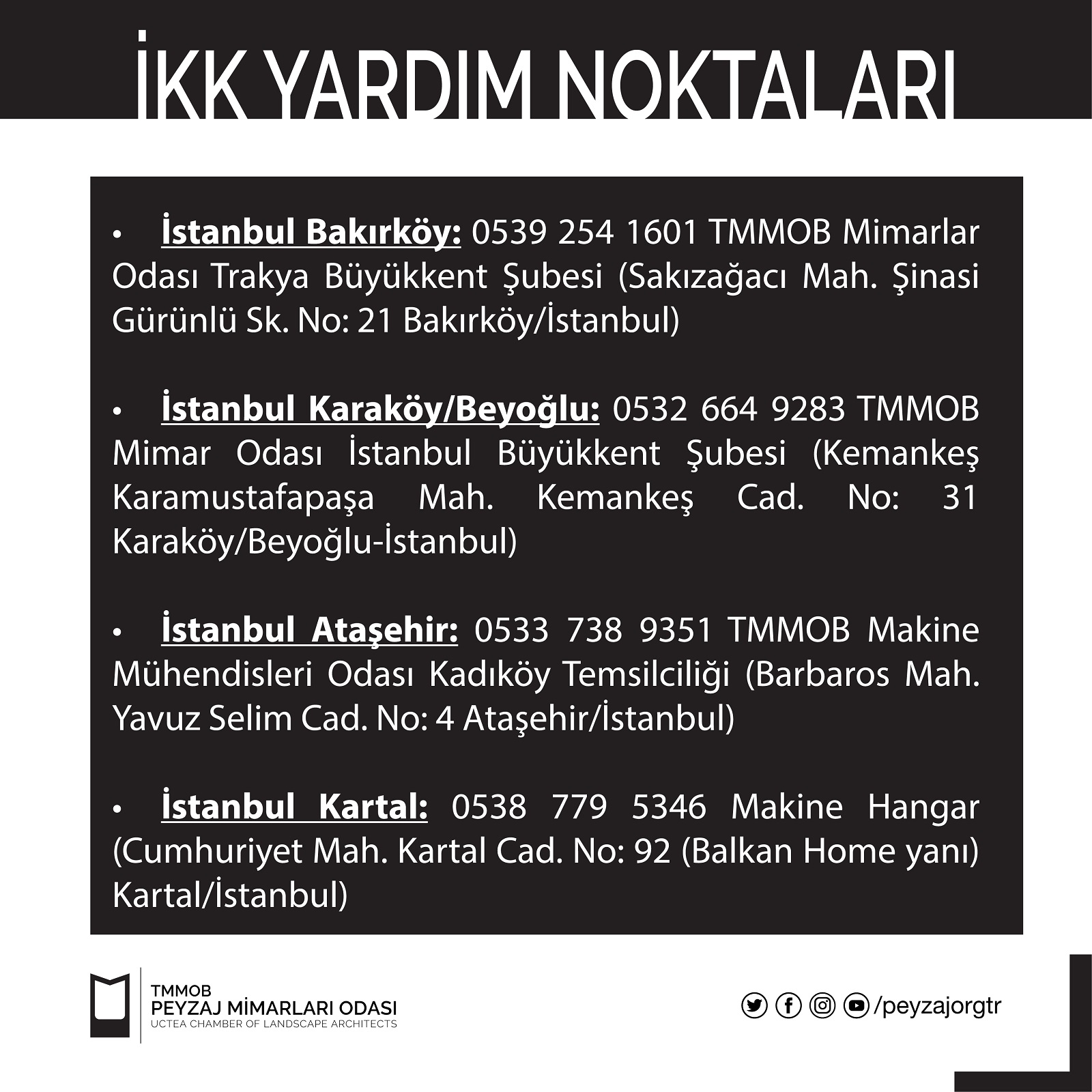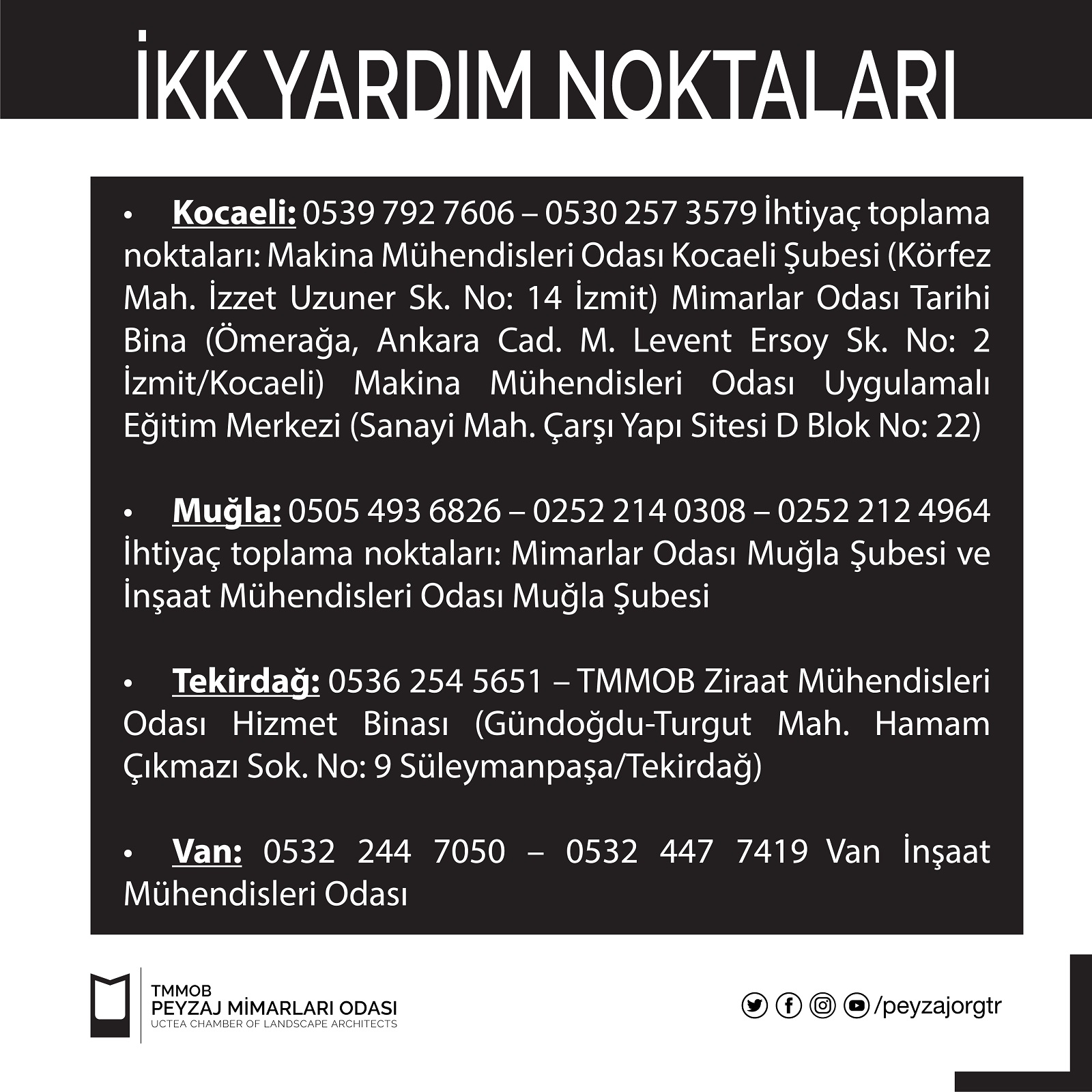 Kocaeli: 0539 792 7606 - 0530 257 3579 İhtiyaç toplama noktaları: Makina Mühendisleri Odası Kocaeli Şubesi (Körfez Mah. İzzet Uzuner Sk. No: 14 İzmit) Mimarlar Odası Tarihi Bina (Ömerağa, Ankara Cad. M. Levent Ersoy Sk. No: 2 İzmit/Kocaeli) Makina Mühendisleri Odası Uygulamalı Eğitim Merkezi (Sanayi Mah. Çarşı Yapı Sitesi D Blok No: 22)