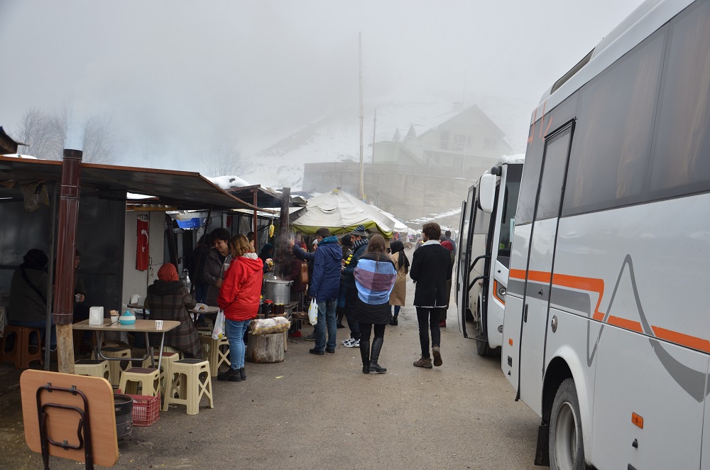 Pazar sabahı 07.15`te iki otobüs olarak Yedi göllere gitmek için hareket ettik. Ankara-İstanbul otoyolundan Bolu şehir merkezine girip, şehir merkezinden Yedigöller tabelalarını takip ederek doğa harikası eşliğinde tepeye çıkışımız ve inişimiz başladı. Burada közde patates, kestane, haşlanmış mısır ve semaverde çay molası verdik. Moladan sonra Yedigöllere ulaşmak için inişe geçtik.
