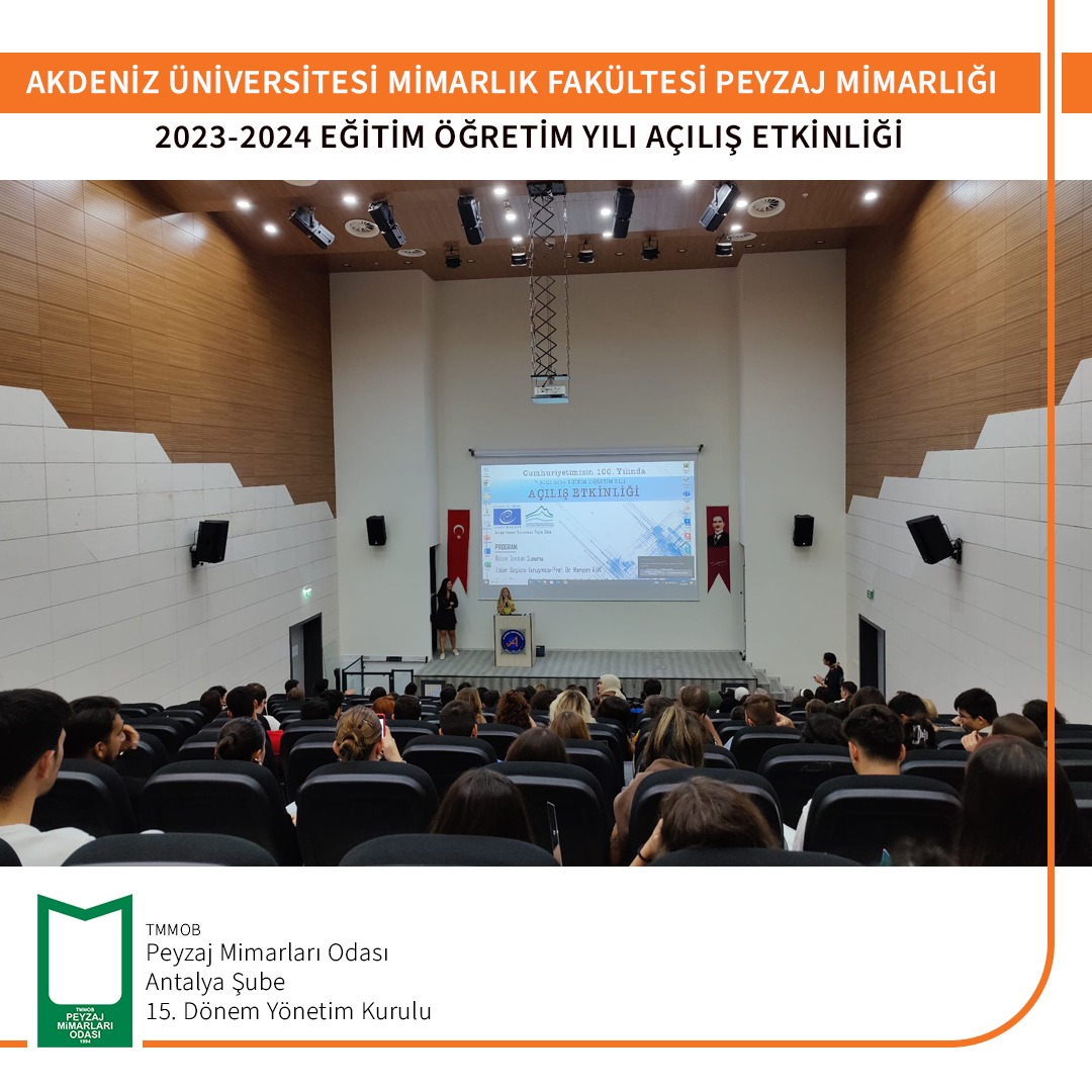 Akdeniz Üniversitesi Mimarlık Fakültesi Peyzaj Mimarlığı Bölümü tarafından düzenlenen 2023 -2024 Eğitim Öğretim Yılı Açılış etkinliğine Şube Başkanımız Gülsüm Kıldan katılım sağlamıştır.