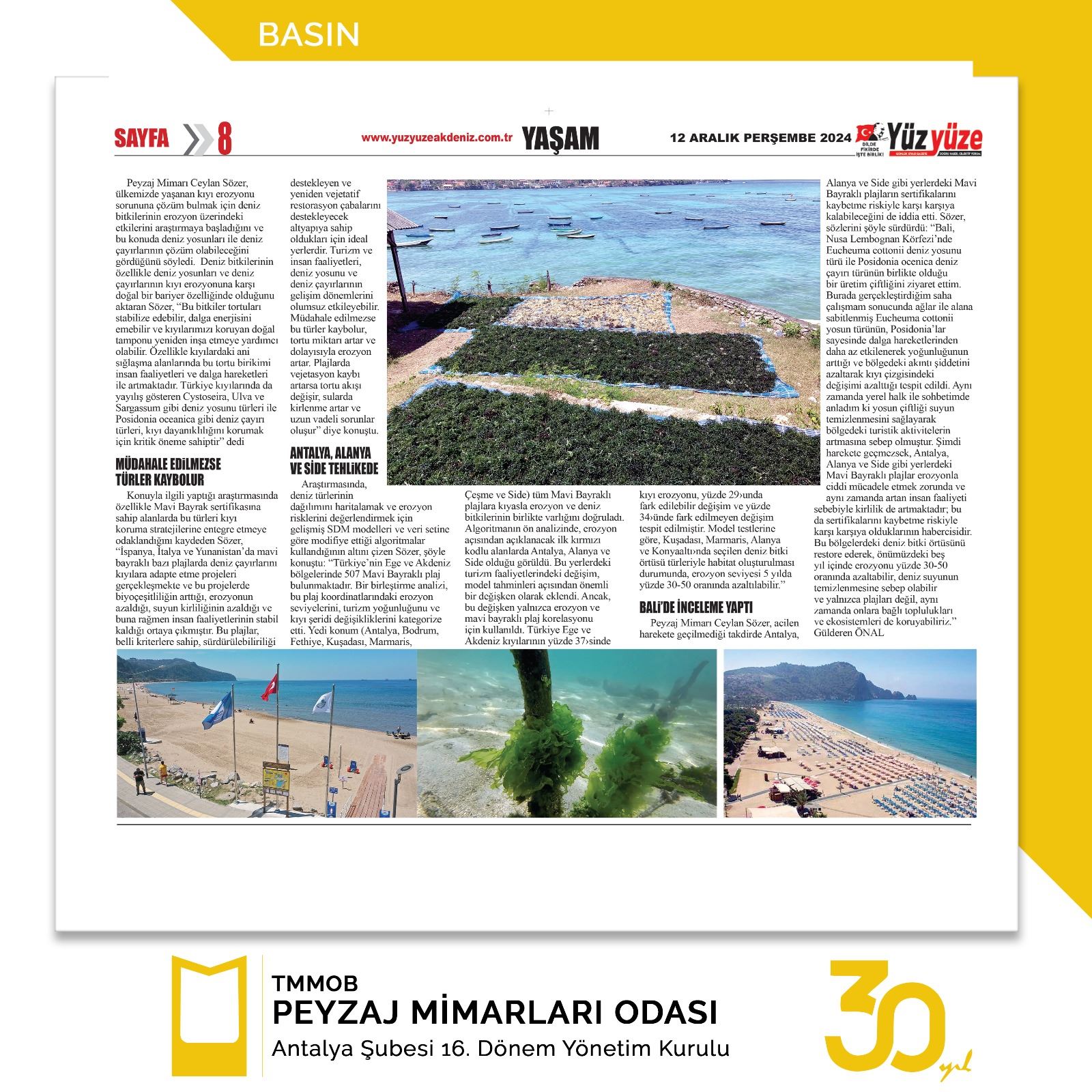 Peyzaj Mimarı Ceylan Sözer,ülkemizde yaşanan kıyı erozyonu sorununa çözüm bulmak için deniz bitkilerinin erozyon üzerindeki etkilerini araştırmaya başladığını ve bu konuda deniz yosunları ile deniz çayırlarının çözüm olabileceğini gördüğünü söyledi. Deniz bitkilerinin özellikle deniz yosunları ve deniz çayırlarının kıyı erozyonuna karşı doğal bir bariyer özelliğinde olduğunu aktaran Sözer, “Bu bitkiler tortuları stabilize edebilir, dalga enerjisini emebilir ve kıyılarımızı koruyan doğal tamponu yeniden inşa etmeye yardımcı olabilir. Özellikle kıyılardaki ani sığlaşma alanlarında bu tortu birikimi insan faaliyetleri ve dalga hareketleri ile artmaktadır. Türkiye kıyılarında da yayılış gösteren Cystoseira, Ulva ve Sargassum gibi deniz yosunu türleri ile Posidonia oceanica gibi deniz çayırı türleri, kıyı dayanıklılığını korumak için kritik öneme sahiptir” dedi